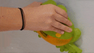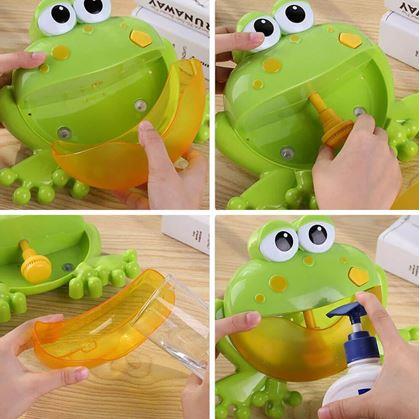 Nejprve odšroubujte zadní krytku na žábě, a vložte baterie. Žábu nalepte pomocí přísavek na hladký rovný povrch – nejlépe dlaždice. Žabí tlamu vyjměte a naplňte vodou smíchanou s mýdlem nebo pěnou do koupele. Čím více mýdla namícháte, tím více bude bublinek. Vložte do otvoru žlutou trysku a tlamičku nasaďte zpátky. Nyní stačí zapnout tlačítko a zábava může začít. S veselou žábou bude případný strach z vody překonán.