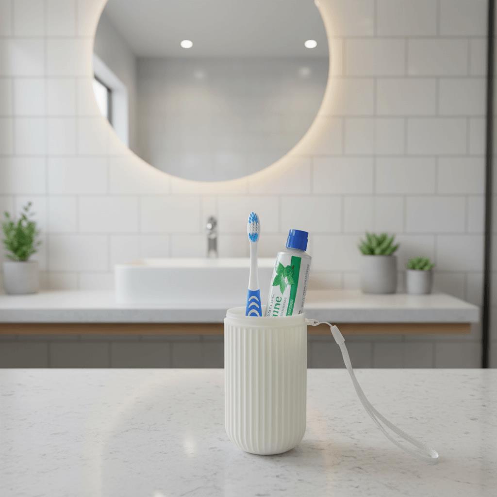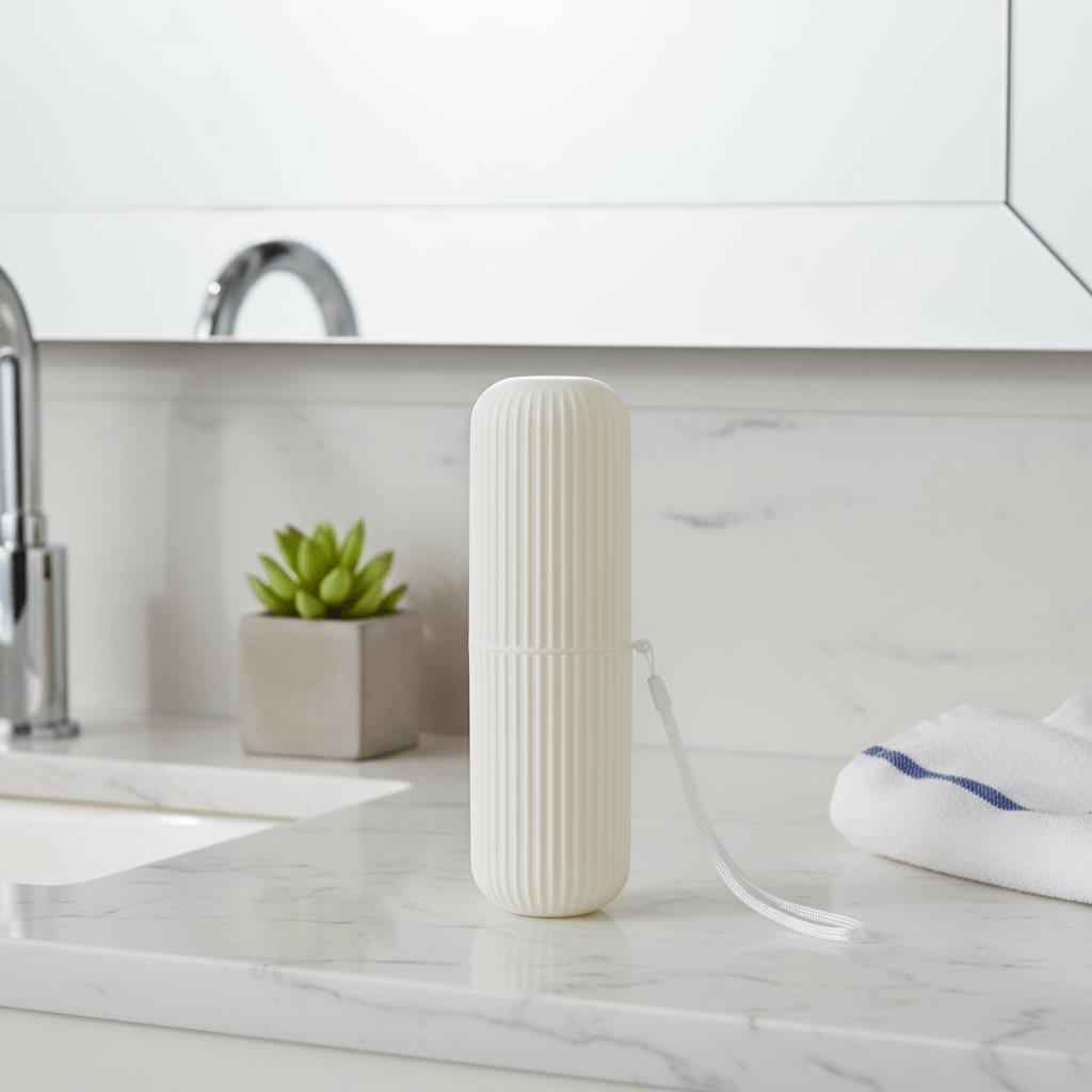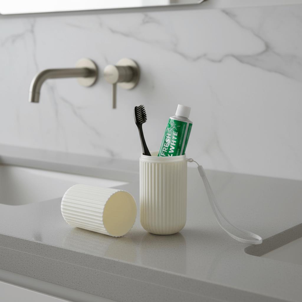 Cestovní pouzdro na zubní kartáček a pastu je ideální společník na cesty, výlety i každodenní přenášení do práce či školy. Elegantní design v krémovém barevném provedení zaujme na první pohled. Pouzdro je vyrobeno z odolného plastu, který ochrání kartáček i pastu před poškozením nebo znečištěním. Díky svému kompaktnímu tvaru se snadno vejde do tašky, batohu i kufru. Praktické poutko umožňuje snadné zavěšení nebo přenášení. Pouzdro se skládá ze dvou částí, které lze využít i jako kelímky. Stylové a hygienické řešení pro všechny, kdo si chtějí uchovat svůj úsměv i na cestách.