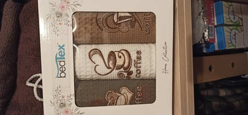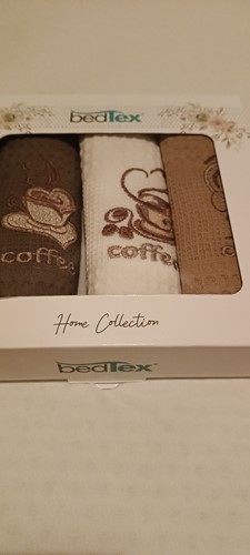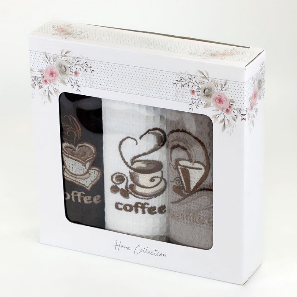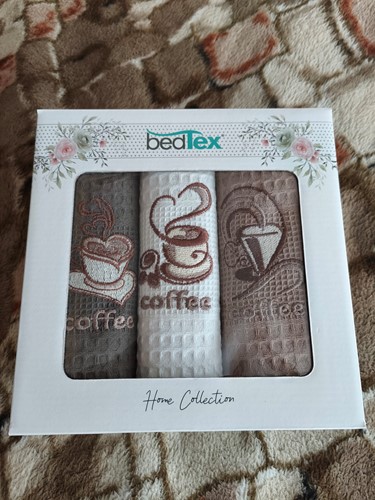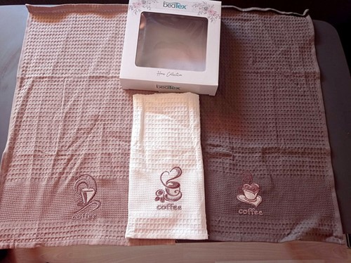 • Vaflové utěrky v dárkové sadě s dekorem hrnků kávy a nápisy "coffee"