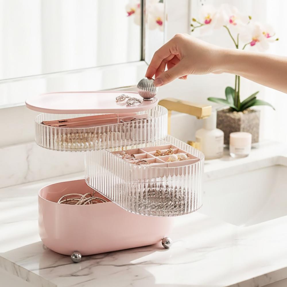 Každá milovnice šperků ví, že jich není nikdy dost. S tím se ale pojí jeden malý problém – kam je všechny uložit, aby v nich byl nejen pořádek, ale hlavně se nepoškodily? Pro všechny, které svým cennostem chtějí dopřát prostor, v němž budou chráněny před vnějšími vlivy a zároveň je budou mít hned při ruce, máme tuto překrásnou šperkovnici. Elegantní a přehledná, krásná a skvělá díky otočným přihrádkám, taková je tato třípatrová šperkovnice, která bezpečně uschová vaše řetízky, náramky, náušnice, prstýnky, ale i třeba hodinky a brože. Bude se vyjímat na každém kosmetickém stolku a dodá mu nádech luxusu. Její klasický vzhled ocení i ti, co mají rádi minimalismus, jelikož kombinuje decentní starorůžovou barvu se stříbrnými detaily a průhledné vroubkované přihrádky.