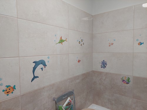 K dispozici máte dostatek nálepek, které děti mohou kreativně rozmístit na dlaždičky, zrcadlo, vanu, sprchový kout nebo na okna. Nálepky jsou vyrobeny z přilnavého materiálu bez lepidla, což znamená, že je můžete snadno přemístit a znovu použít, aniž by zanechaly stopy nebo poškodily povrch.