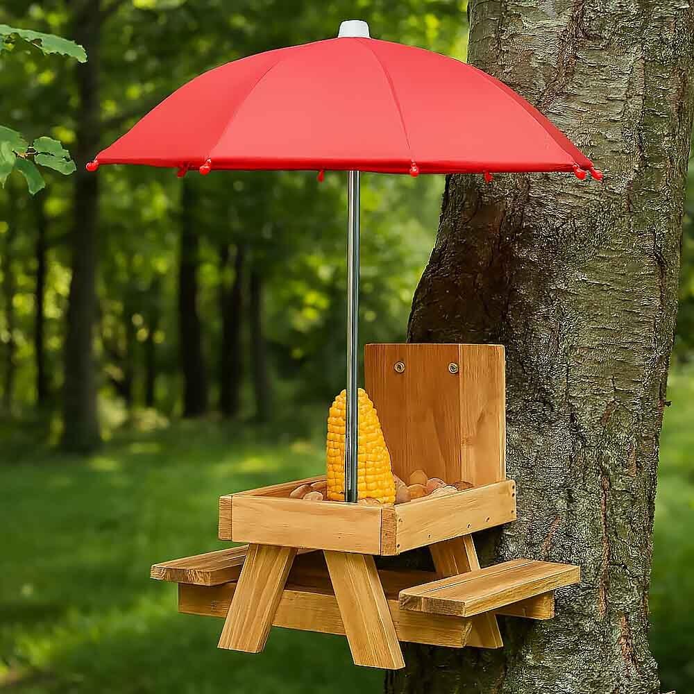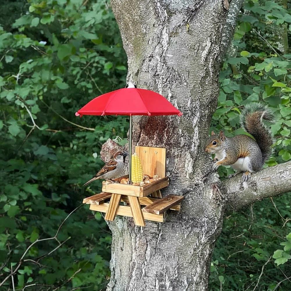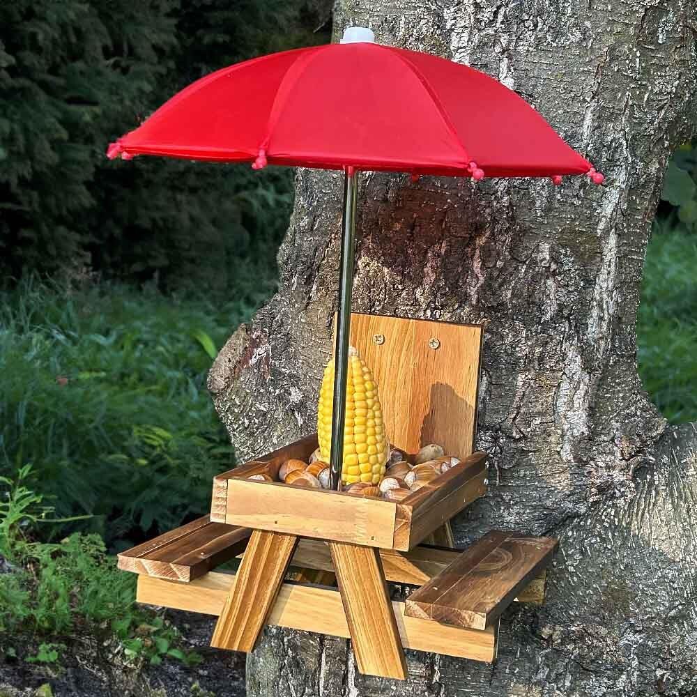 Také rádi přilepšíte ptáčkům, kteří létají na vaši zahradu nebo vás navštěvují na balkóně či na terase? Tak to jistě máte doma krmítko, do kterého jim sypete dobroty. Na trhu je jich spousty, my však pro vás máme jedno takové, s nímž bude sledování divokých návštěvníků ještě větší zábava! Veselé dřevěné krmítko totiž vypadá jako klasický piknikový stůl a navíc je k němu i deštník! Ptáčci nebo veverky a jiná zvířátka tak budou mít vtipné posezení podobné tomu lidskému, s deštníkem, který ochrání jejich jídlo před kapkami deště i slunečními paprsky. Udělejte malým návštěvníkům radost a umístěte jej třeba na plot a pak už jen sledujte, jak si pochutnávají na všech těch lahůdkách, které jste jim naservírovali. Budete tak ještě o maličko blíže přírodě a sledování zvířátek vám třeba spolu s šálkem dobré kávy uklidní mysl a zlepší den.