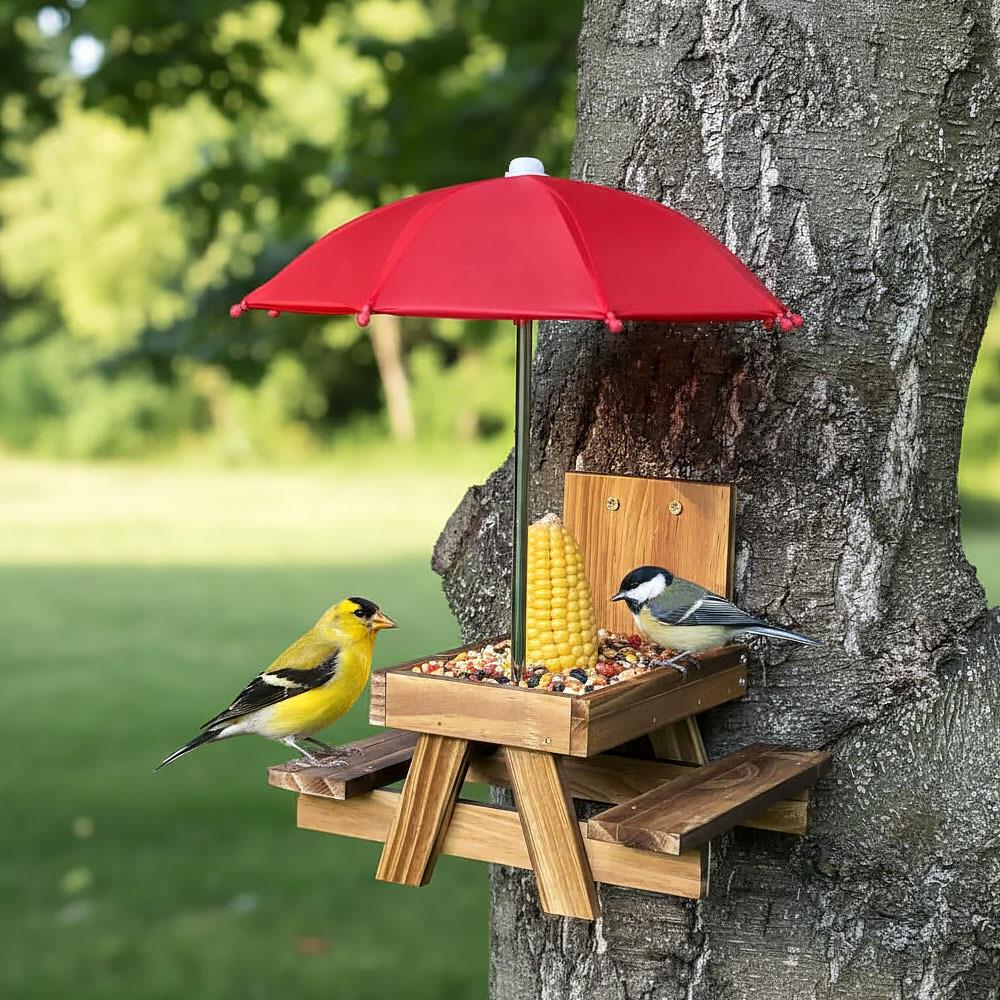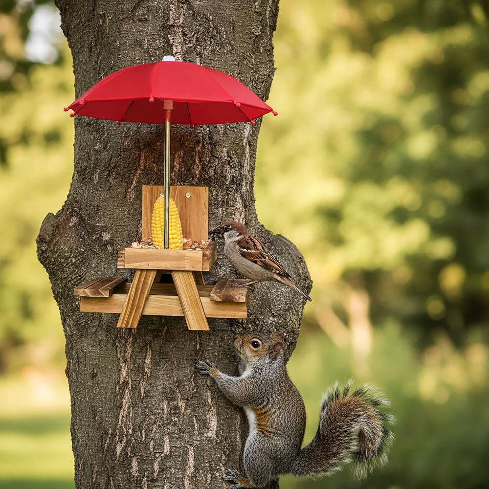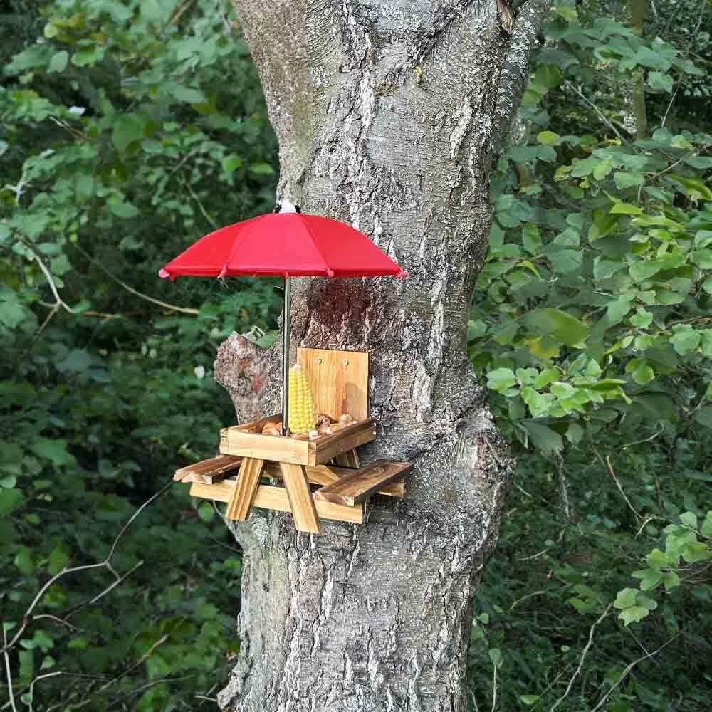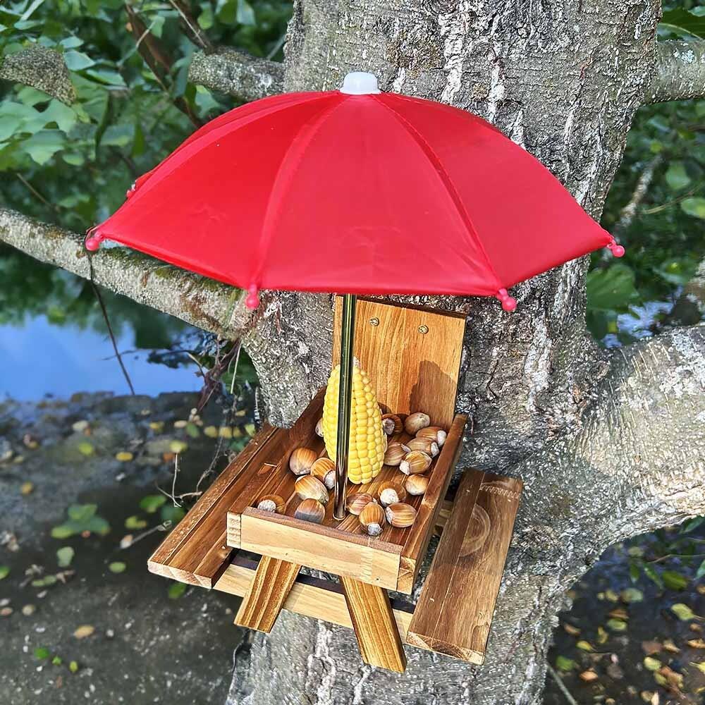 Také rádi přilepšíte ptáčkům, kteří létají na vaši zahradu nebo vás navštěvují na balkóně či na terase? Tak to jistě máte doma krmítko, do kterého jim sypete dobroty. Na trhu je jich spousty, my však pro vás máme jedno takové, s nímž bude sledování divokých návštěvníků ještě větší zábava! Veselé dřevěné krmítko totiž vypadá jako klasický piknikový stůl a navíc je k němu i deštník! Ptáčci nebo veverky a jiná zvířátka tak budou mít vtipné posezení podobné tomu lidskému, s deštníkem, který ochrání jejich jídlo před kapkami deště i slunečními paprsky. Udělejte malým návštěvníkům radost a umístěte jej třeba na plot a pak už jen sledujte, jak si pochutnávají na všech těch lahůdkách, které jste jim naservírovali. Budete tak ještě o maličko blíže přírodě a sledování zvířátek vám třeba spolu s šálkem dobré kávy uklidní mysl a zlepší den.