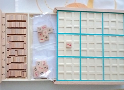 Pro milovníky Sudoku super. V papírové knize si najde předlohu zadání. Tu si vyskládá na dřevěnou hrací plochu (červené číslice). V šuplíčku je pak zásoba destiček od 1 do 9 (s černými číslicemi). Lze snadno přidat anebo odebrat čislici na desku. Nový rozměr hraní Sudoku.
