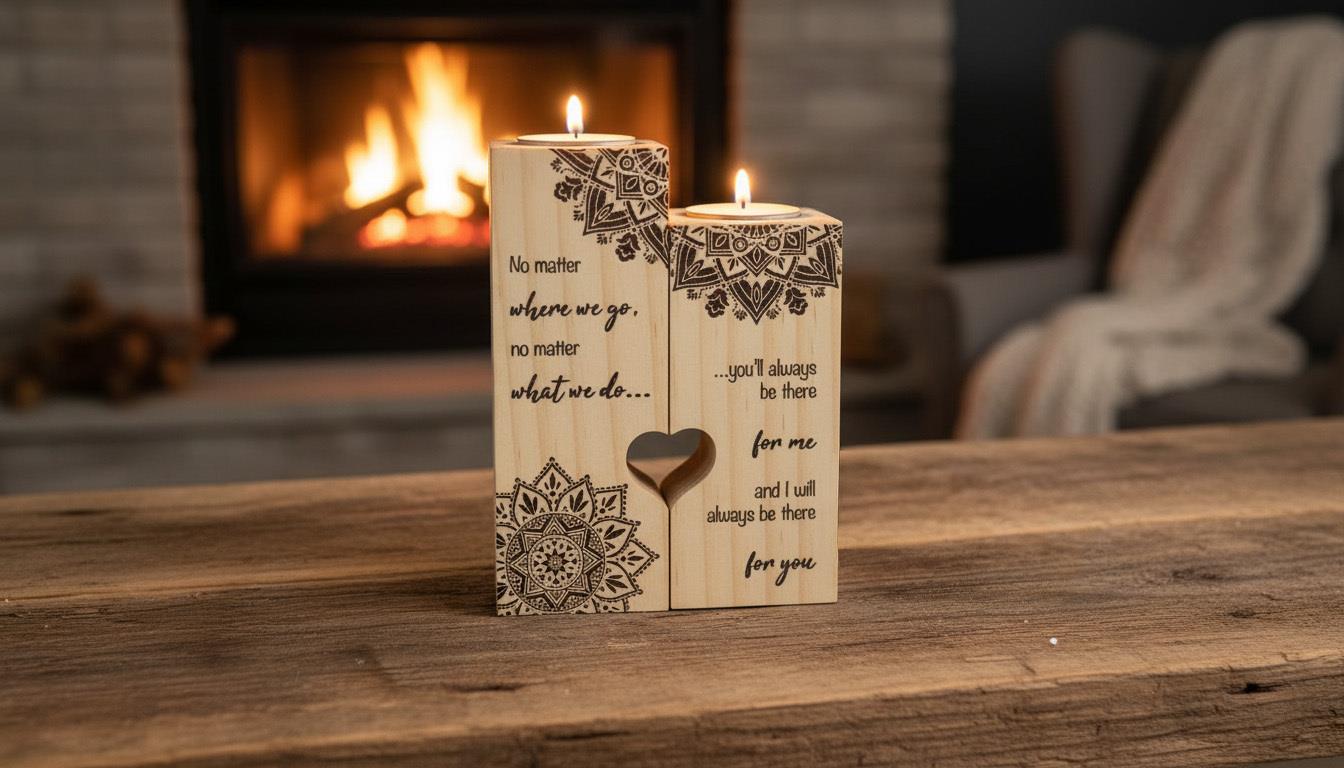 Tyto dřevěné svícny na čajové svíčky pro páry nejsou jen dekorací, ale především nositelem emocí. Každý set obsahuje dva svícny různé výšky, které k sobě patří – stejně jako dva lidé, které spojuje láska, přátelství a hluboké pouto.