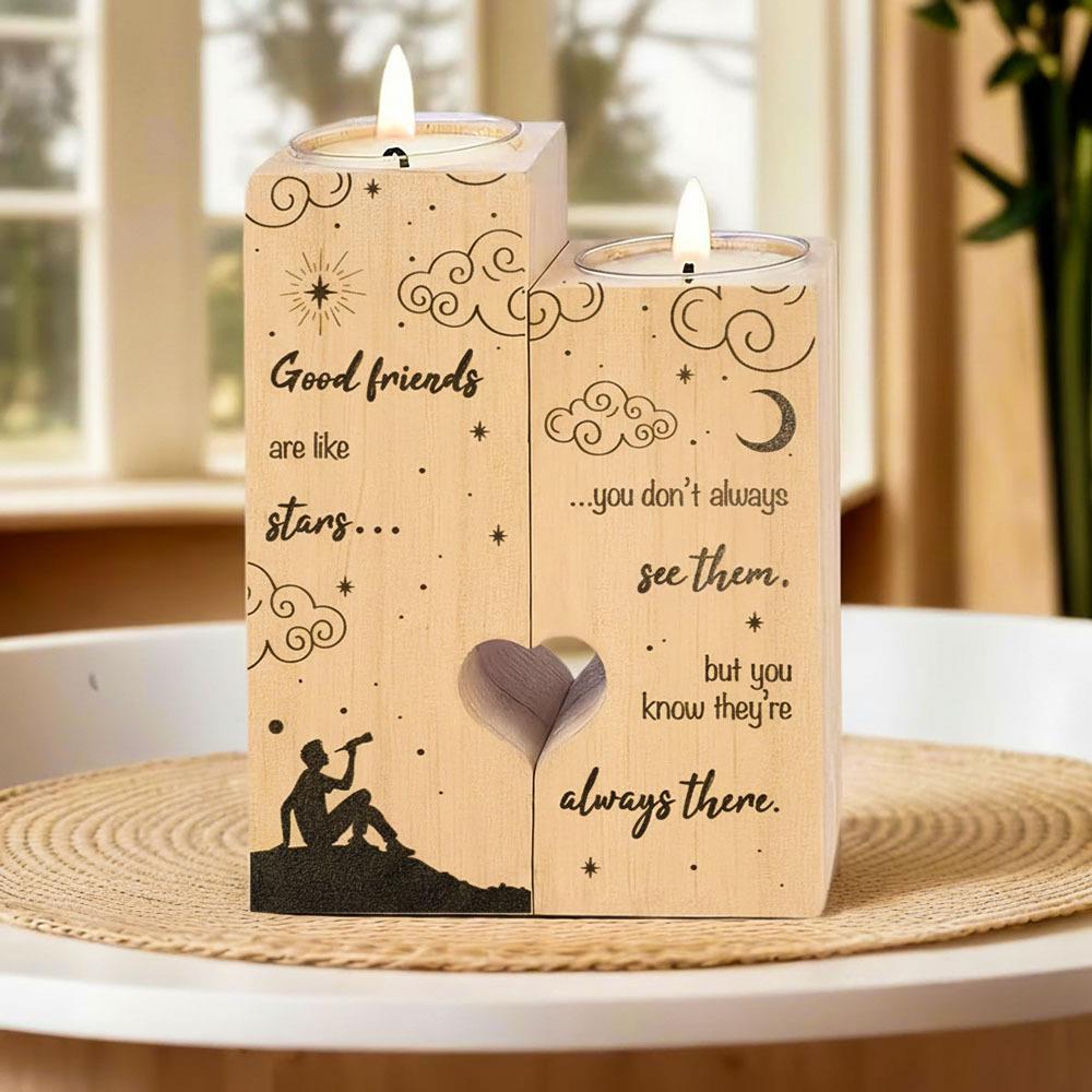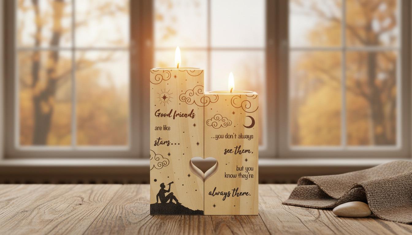 Tyto dřevěné svícny na čajové svíčky pro páry nejsou jen dekorací, ale především nositelem emocí. Každý set obsahuje dva svícny různé výšky, které k sobě patří – stejně jako dva lidé, které spojuje láska, přátelství a hluboké pouto.