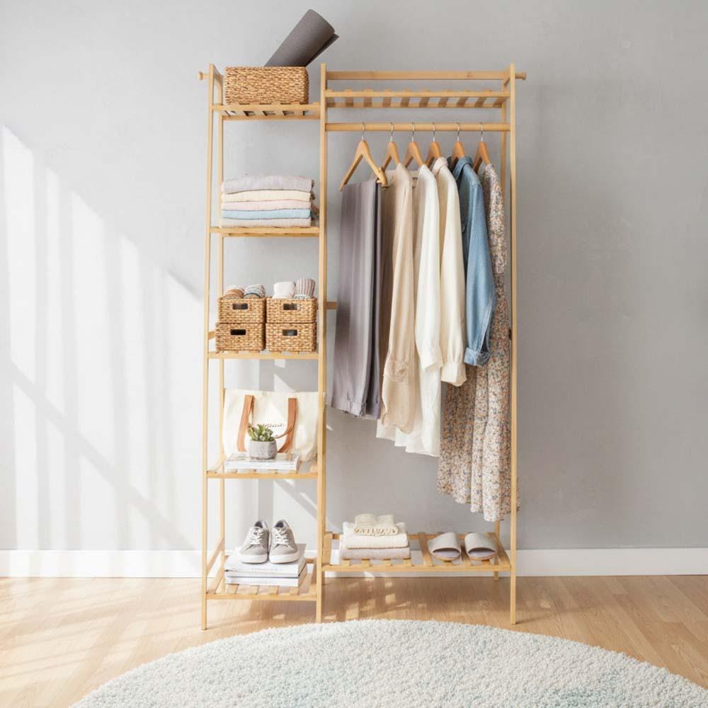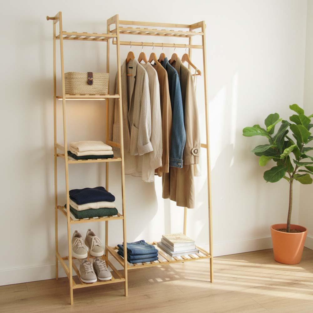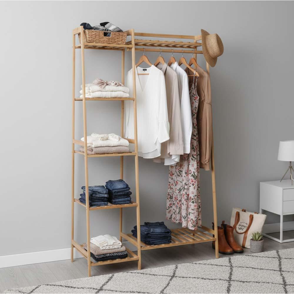 Dřevěný stojan na oblečení je ideálním řešením pro každého, kdo chce mít ve svých věcech pořádek. Kombinuje praktický věšák s policemi, díky kterým snadno uspořádáte oblečení i doplňky. Vše budete mít přehledně na jednom místě. Přírodní design dodá interiéru útulnou atmosféru a je vhodný do ložnice, šatny i předsíně. Nabízí dostatek prostoru pro každodenní využití.
