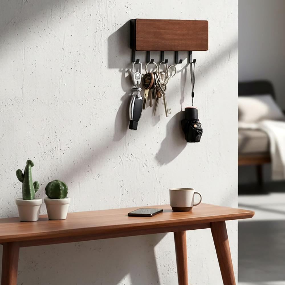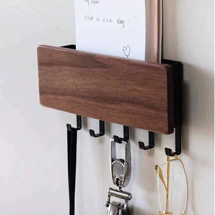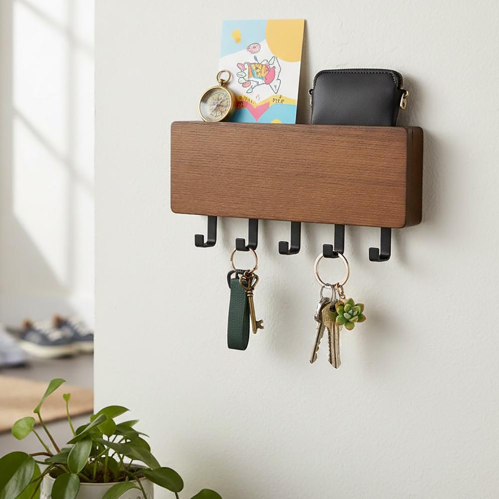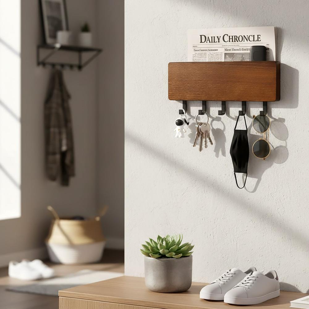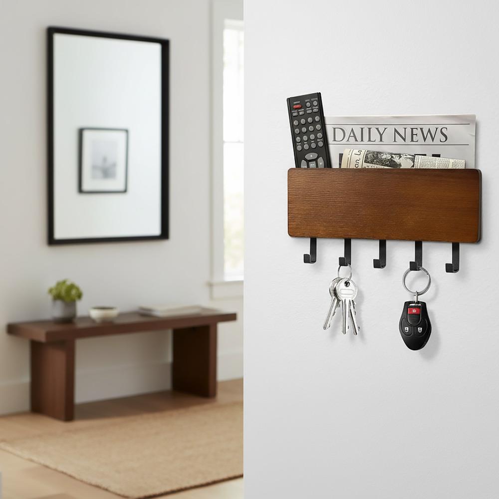 Tento stylový dřevěný věšák na klíče s pěti háčky a praktickou přihrádkou je ideálním doplňkem do každé domácnosti. Umožňuje vám udržet všechny klíče, poštu a další drobnosti na jednom místě, což usnadňuje organizaci a zajišťuje, že vždy víte, kde co máte.  Věšák lze využít i na jiné věci než klíče. Uvítáte ho i na drobné kuchyňské potřeby či na lehké nářadí v dílně. Multifunkční věšák má horní přihrádku na poštu či letáky. Montáž je rychlá a jednoduchá, ať už zvolíte nalepení nebo navrtání. Přírodní dřevěný materiál pomůže zútulnit váš domov. Je elegantní a hodí se do každé domácnosti.