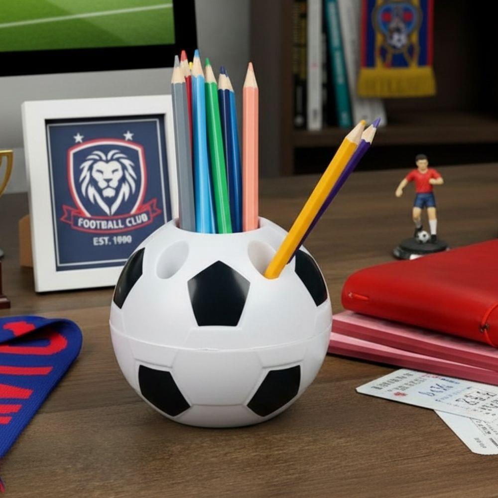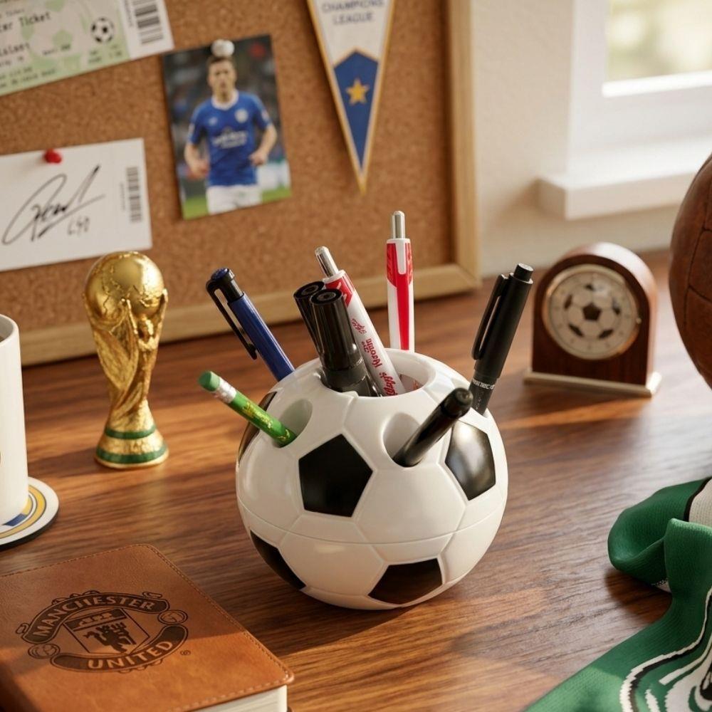 Držák na tužky ve tvaru fotbalového míče je praktický a zároveň designový doplněk, který oživí každý pracovní stůl. Díky originálnímu vzhledu potěší nejen milovníky fotbalu, ale i všechny, kteří chtějí mít své psací potřeby přehledně uspořádané. Kombinace pěti menších a jednoho většího otvoru umožňuje snadné rozdělení různých typů pomůcek.