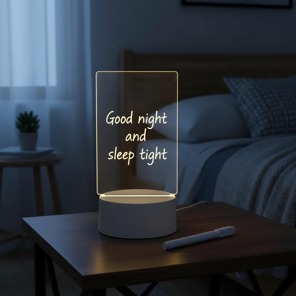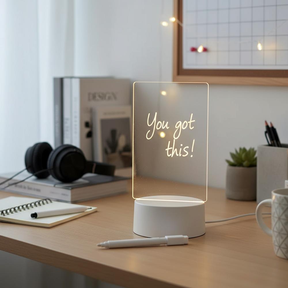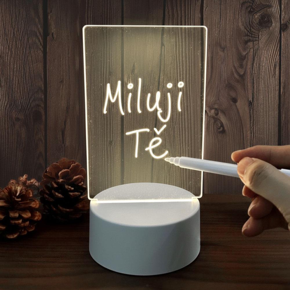 Dobré ráno, dobrou noc, nezapomeň na to a to – když je v domácnosti šrumec, často se spoléháme na drobné vzkazy, abychom předali informace našim blízkým, které kvůli vytížení chtě nechtě občas zanedbáváme. Obyčejné lístečky nebo nápisy na lednici však nejen někdy zmizí, ale rozhodně nemají takové kouzlo, jako tato originální stolní lampička, která váš vzkaz doručí za záře svého světla a ještě potěší. Skvěle se bude hodit na noční stolek, kdy s ní popřejete hezké sny, ale i na pracovní stůl, abyste už nezapomněli na důležité úkoly. Vezměte do ruky přiložený fix a napište vše, co máte na srdci. Jakmile se lampička rozsvítí, informace se předá dál, a když bude třeba odpovědět, hadříkem se původní text vymaže a napíše vzkaz nový. S lampičkou tak získáte společníka, s jehož pomocí nejen něco řeknete, ale také se vaše zpráva neztratí – ať už fyzicky, tak v mysli příjemce.
