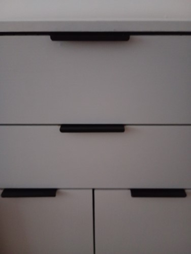 Předem připravené otvory v madlech vám usnadní práci při montáži (šroubky jsou součástí balení). Druhá strana má zahnutý roh, za který madlo uchopíte a škíňku pohodlně otevřete. S madlem tedy manipulejete ze spodní strany, tudíž se zbavíte starostí s věčným leštěním.