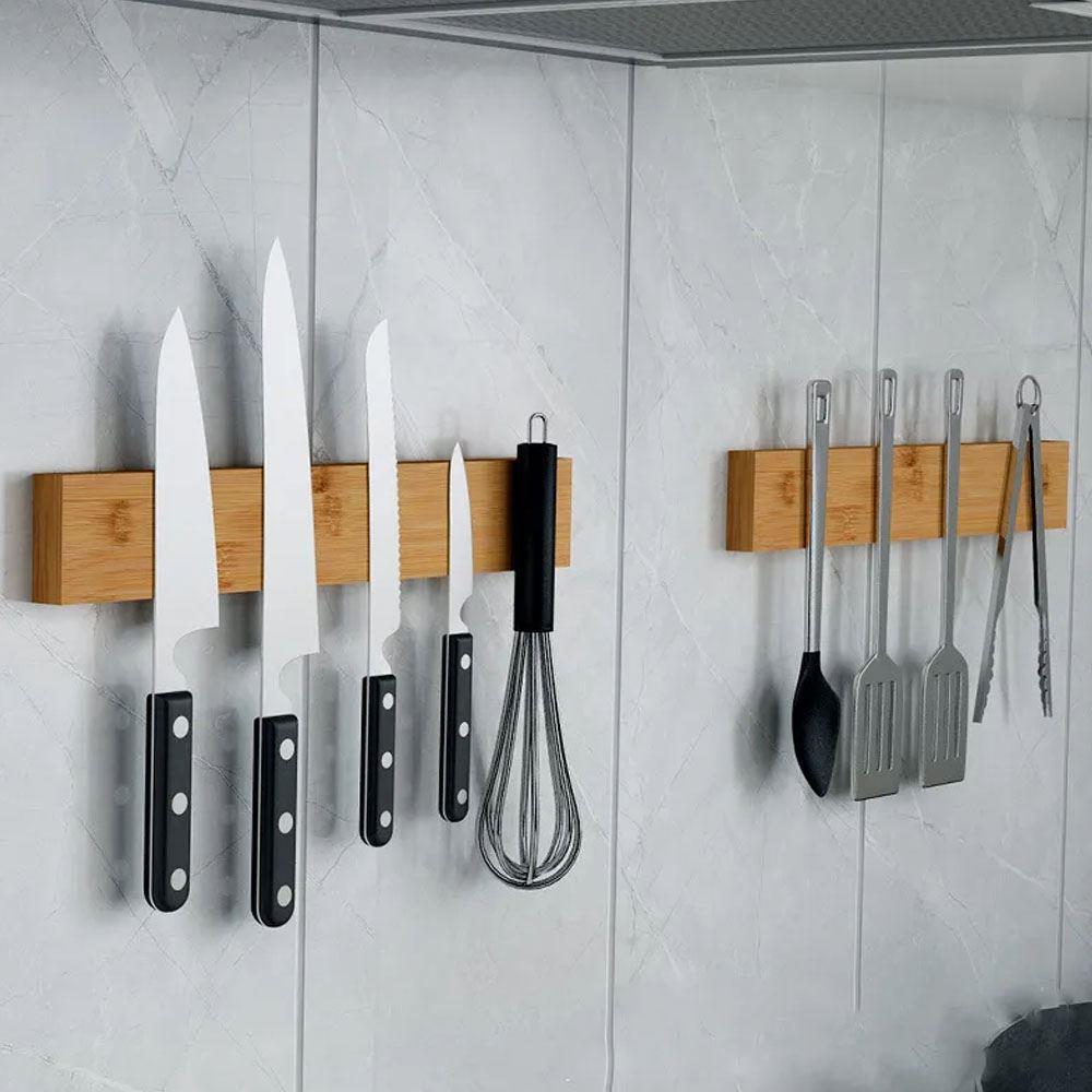 Držák v designu dřeva doladí k dokonalosti každou moderní kuchyni. Díky silnému magnetu uvnitř poslouží k uchycení nožů, sekáčků, nůžek, ale také kovových obraceček a dalšího náčiní.