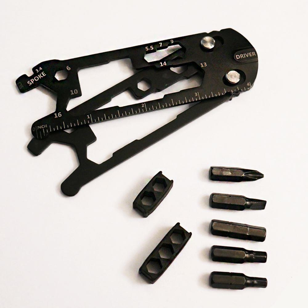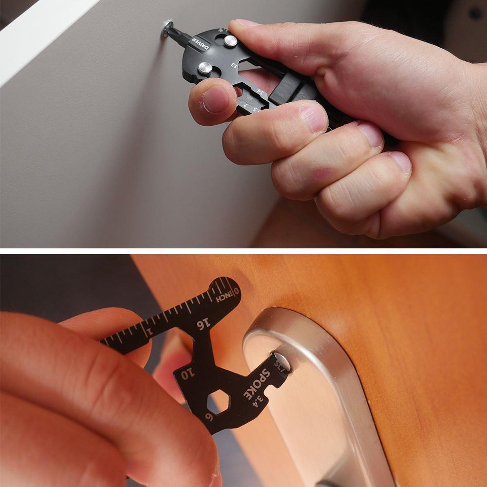 Praktický multinástroj ocení každý, kdo potřebuje občas něco opravit na kole, v domácnosti nebo v dílně. Navzdory malým rozměrům má multinástroj mnoho užitečných funkcí a funkčních prvků, jako jsou zabudované klíče, bity, řezačka nebo pravítko v centimetrech a palcích.