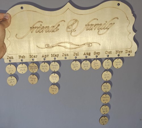 Sestavit si svůj vlastní rodinný kalendář je velmi jednoduché a zvládne to opravdu každý. Připravte si dřevěný kalendář, kolečka a tužky. Na kolečka napište jména a data narození vašich rodinných příslušníků a přátel. Kolečka potom přiřaďte k jednotlivým měsícům a pomocí kroužků z drátku je připevněte pod daný měsíc. Takto připravený kalendář stačí opatřit provázkem a můžete si jej pověsit na vámi určené místo. Narozeniny vašich blízkých tak budete mít stále na očích a kalendář vám zároveň poslouží jako nápaditá dekorace.