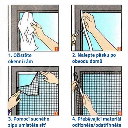 Návod na použití sítě je velmi jednoduchý. Okno orámujte páskou, která je součástí balení. Slepíte z ní ochrannou vrstvu. Na suchý zip pak přitiskněte síť proti hmyzu. Pak už jen stačí oříznout či ostřihnout přečnívající kusy sítě. Totéž můžete udělat i s páskou – tu lze nastříhat také dle velikosti okna. Její největší předností je tedy nastavitelnost! Síť je znovu snímatelná a je vhodné ji prát v ruce!