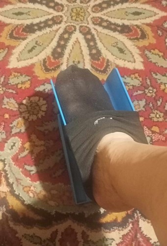 3, Pomocníka si přiložte k noze. Rukojeť zahákněte za háček na držáku, tím držák přidržíte, aby neujížděl. Nohu strčte do středu ponožky a pomalu ji posouvejte dopředu - tím se začne ponožka nasazovat na nohu.