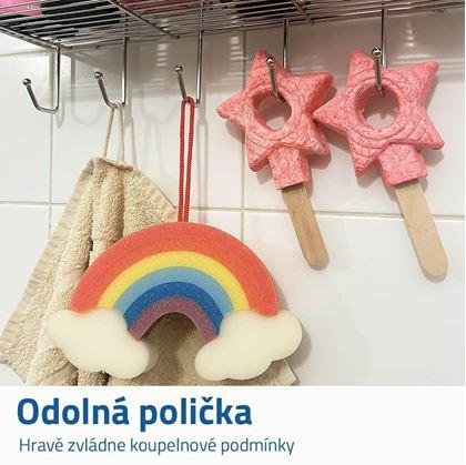 Budete ji však milovat za její instalaci. Ta je totiž bez jakýchkoliv obtíží! Zvládnete ji nalepit sami během chvilky. Poslouží vám k tomu samolepicí obdélník, který umístíte na zeď, obklad či stěnu. K poličce obdržíte i 6 háčků, na které lze zavěsit různé věci - od utěrek, po žínky, mycí houby či jiné koupelnové doplňky.