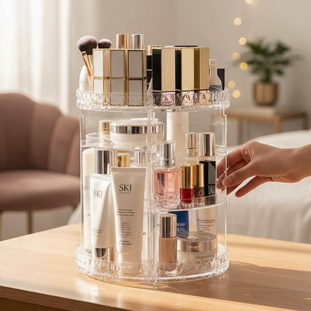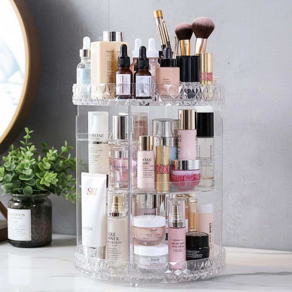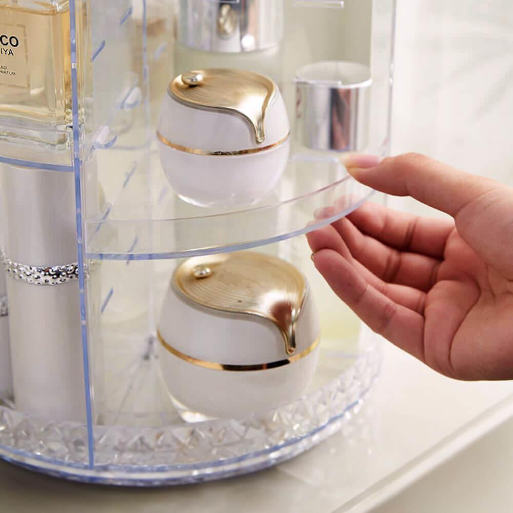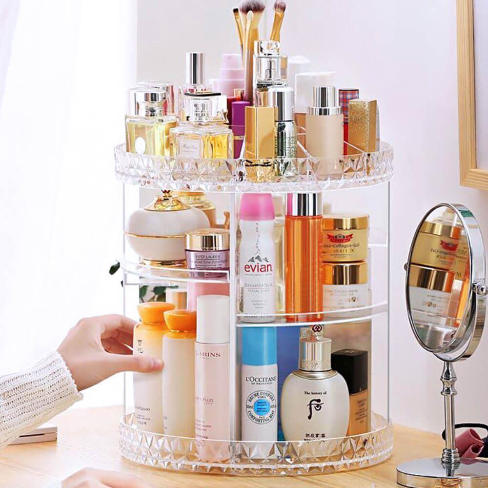 Tento otočný stojan na kosmetiku rázem promění každou poličku v koupelně nebo kosmetický stolek v místo, které doslova srší profesionálním organizací. Už žádné popadané a rozbité lahvičky, už žádné řeči, že toho máte doma příliš. Zatočte s nepořádkem a udělejte si místo třeba i na ten produkt, který si už nějakou dobu přejete pořídit – do stojanu se vejde.