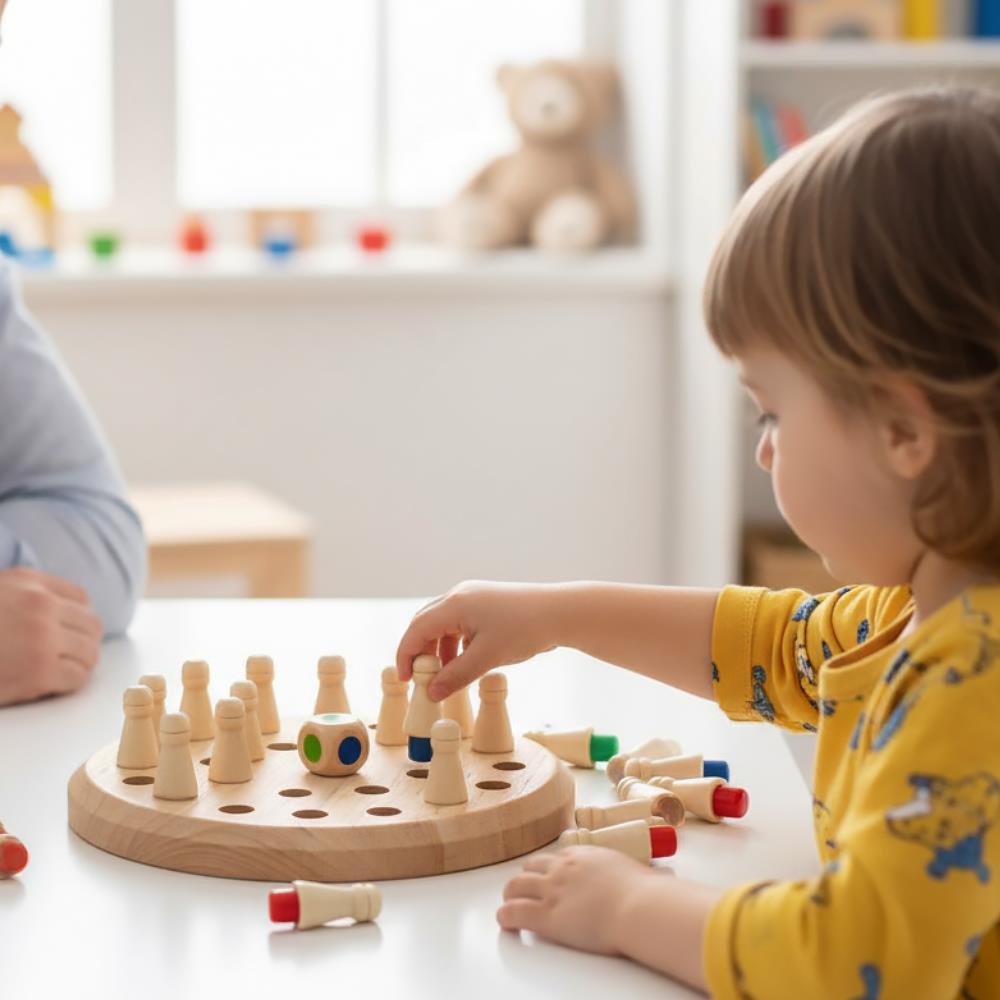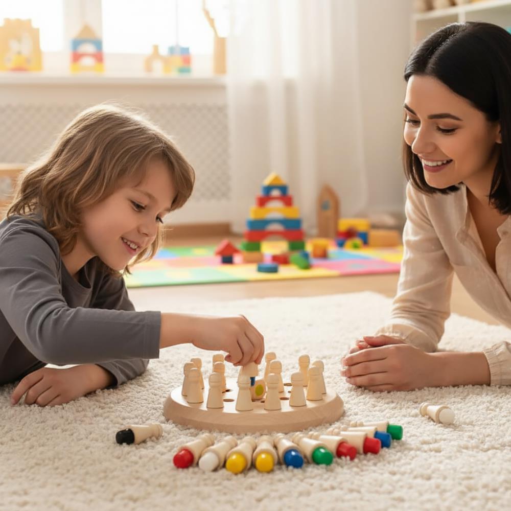 Zábavná dřevěná paměťová hra ve stylu šachů, která procvičí paměť i postřeh. Stačí zapamatovat, kde se figurky nacházejí – a pak správně odhalit dvojice barev. Díky jednoduchému principu, kvalitnímu dřevěnému zpracování a roztomilému designu si hru oblíbí děti i dospělí. Rozvíjí mozek, soustředění i trpělivost – a to úplně bez obrazovky. Hra je jednoduchá, ale za to překvapivě chytlavá.  Zvládnou ji i menší děti, a rodiče se rádi přidají.