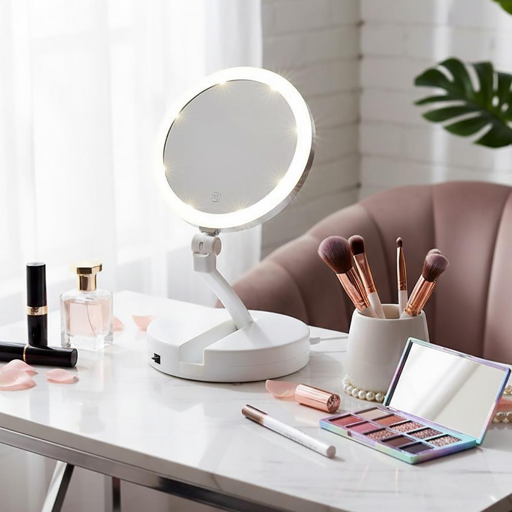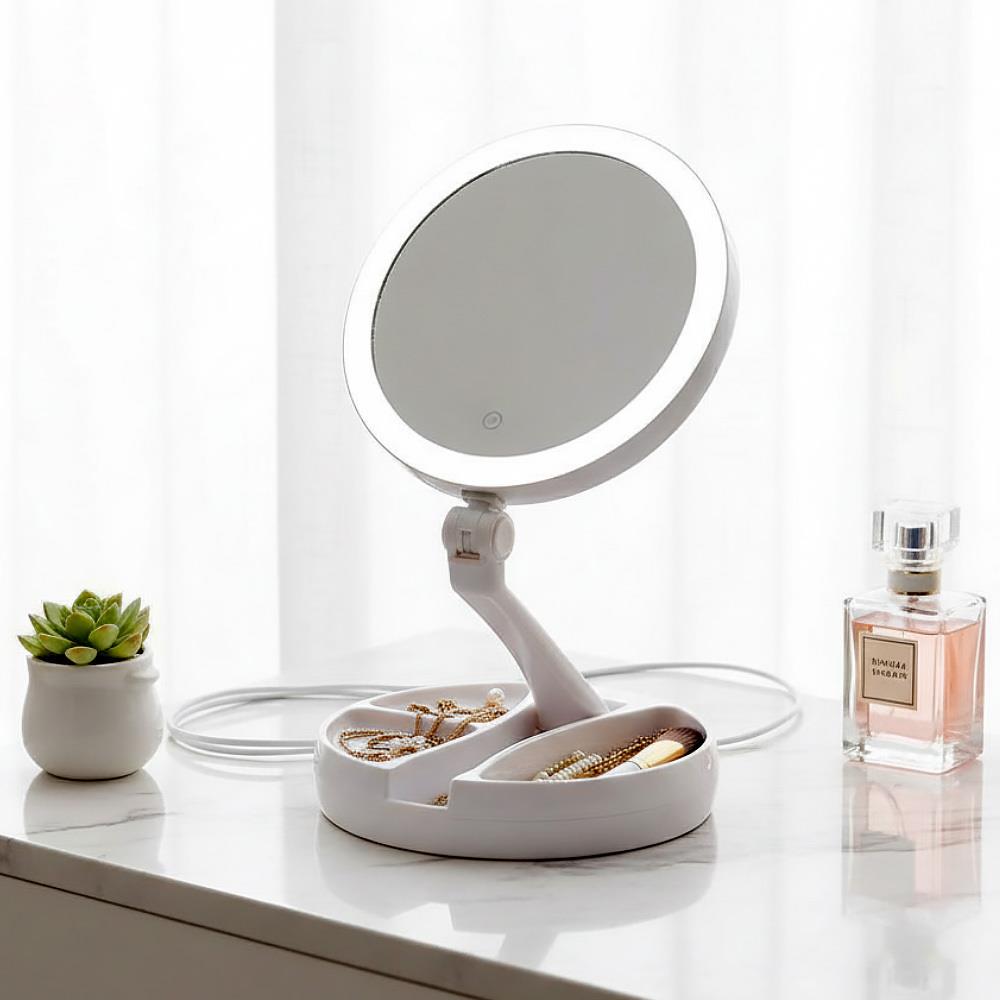 Zrcátko je oboustranné, z toho jedna strana zrcátka zobrazuje klasicky a druhá s desetinásobným zvětšením. V podstavci zrcátka je odkládací prostor na kosmetiku. Zrcátko lze složit do úsporných rozměrů, a díky tomu je velmi praktické například s sebou na dovolenou. Oboustranné zrcátko s podsvícením je velmi pěkný dárek pro každou ženu.