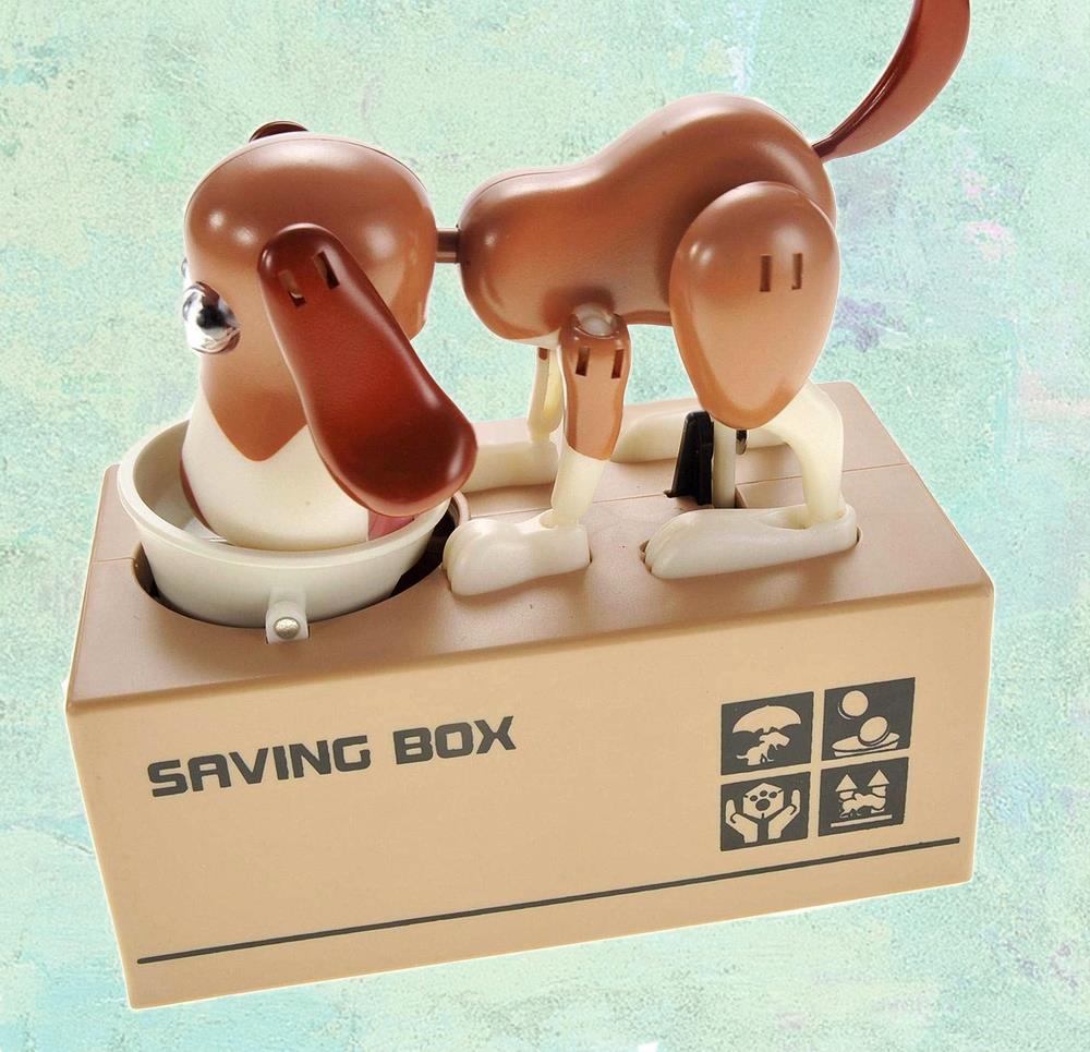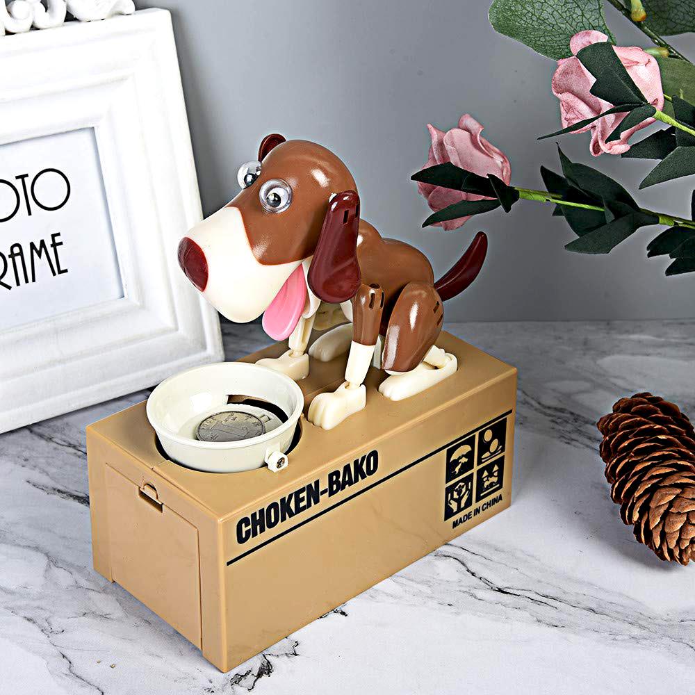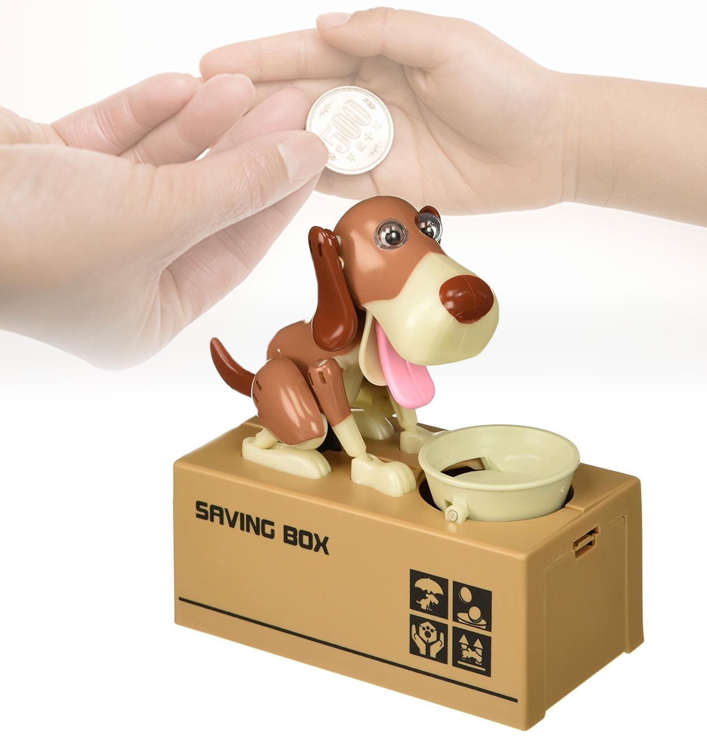 Roztomilá pokladnička v podobě nenasytného pejska. U dětí naprosto zaboduje! Pejsek má pořád hlad, ale jestli si myslíte, že byste u něj uspěli s granulemi, tak ani nápad! Pokud nevěříte, stačí vložit minci do psí misky a můžete se přesvědčit sami. Pejsek v okamžení obživne a vloženou minci spolkne dřív, než se nadějete. A co se mincemi vlastně stane potom? Napoví vám dvířka umístěná v přední části pokladničky.