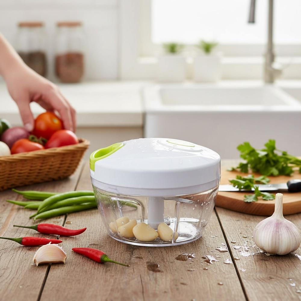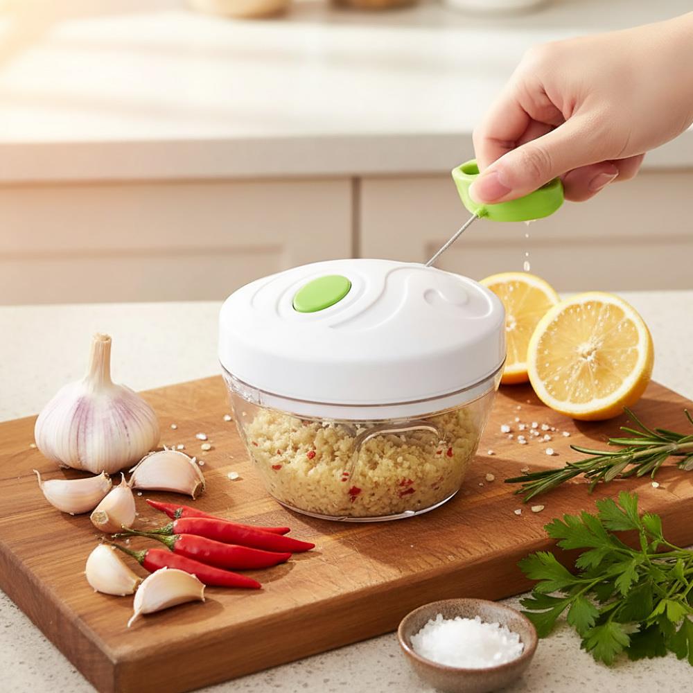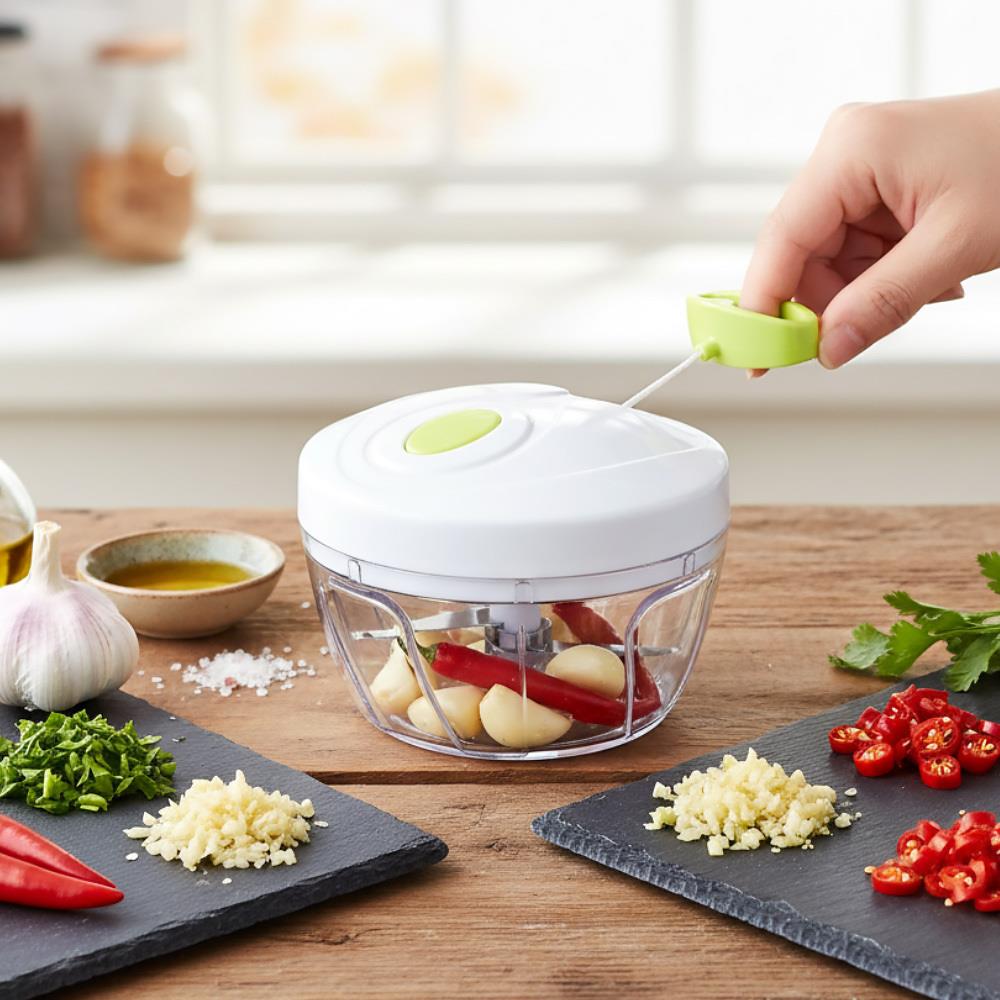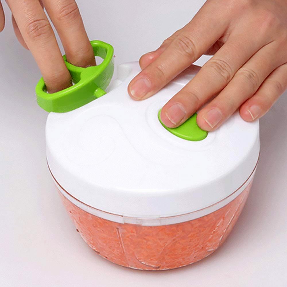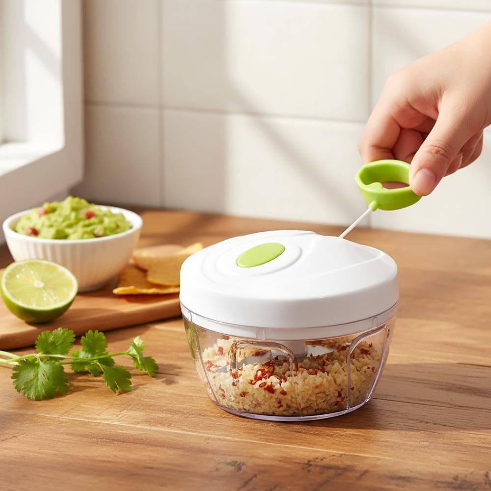 S tímto kuchyňským sekáčkem nasekáte ovoce nebo zeleninu snadno a rychle! Ingredience vložte do misky, zavřete misku pomocí víčka a zatáhněte za táhlo na provázku. Platí, že čím rychleji a s větší silou budete táhlem manipulovat, tím více bude potravina nasekaná. Uvnitř misky je vrtule se třemi ostrými břity, ta zaručí velmi jemné nasekání.
