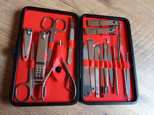Na ruce a nohy použijte kleštičky na nehty, kterými upravte jejich délku, pilníkem zpilujte jejich tvar a odsraňte nečistoty za nehty. Dále se postarejte o kůžičku. Kleštěmi na kůžičku a seřezávačem ji upravíte podle vašeho přání. Pak ji ještě můžete zatlačit zatlačovačem. V sadě nechybí ani pinzeta na odstranění chloupků a nůžky.
