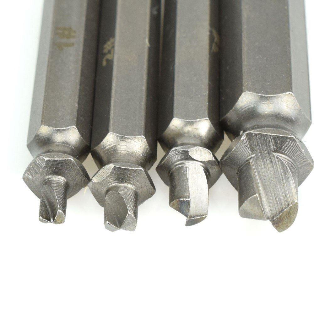 Sada na odstranění zničených šroubů disponuje 4 velikostmi násad. Podle velikosti šroubu zvolíte vhodný typ násady. Každá násada má dvě strany, z nichž každá má svou funkci. Jednou stranou vyvrtáte za pomoci vrtačky do šroubu díru. To usnadní následné vytáhnutí šroubu, které provedete druhou stranou násady. Stačí přetočit násadu a umístit zpět do sklíčidla vrtačky.