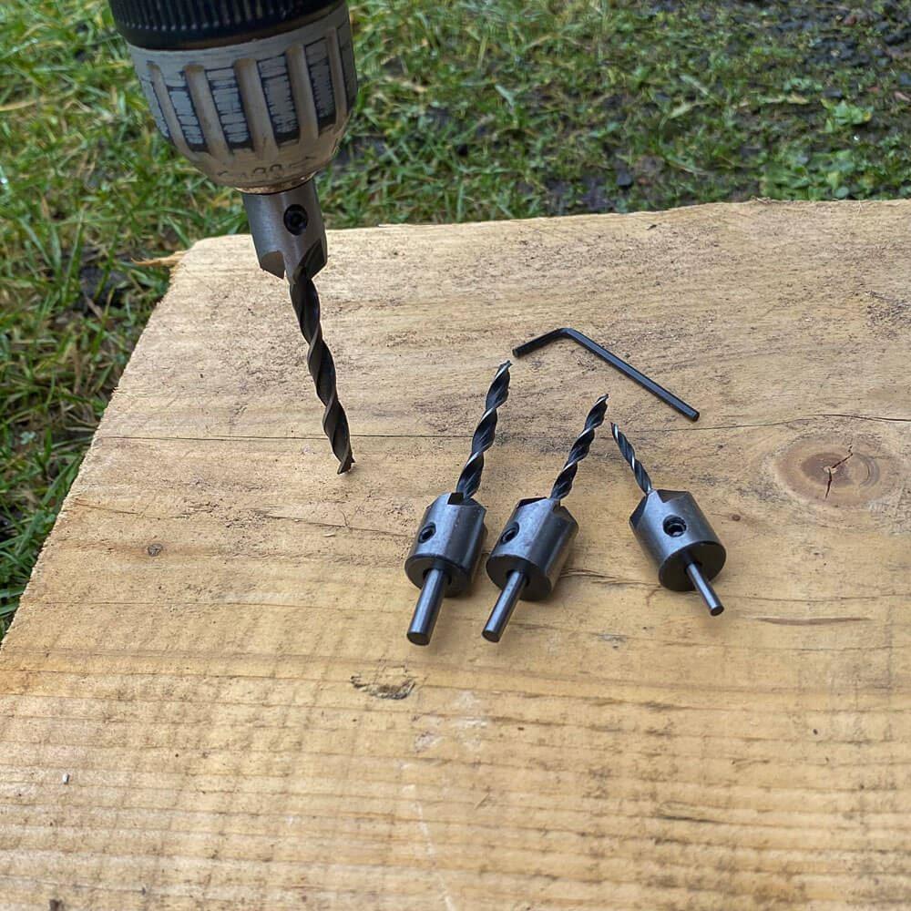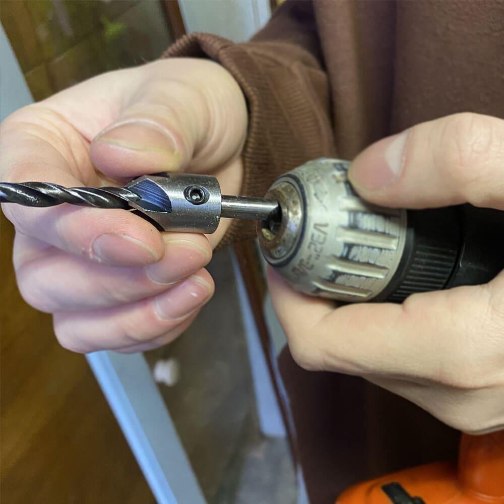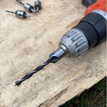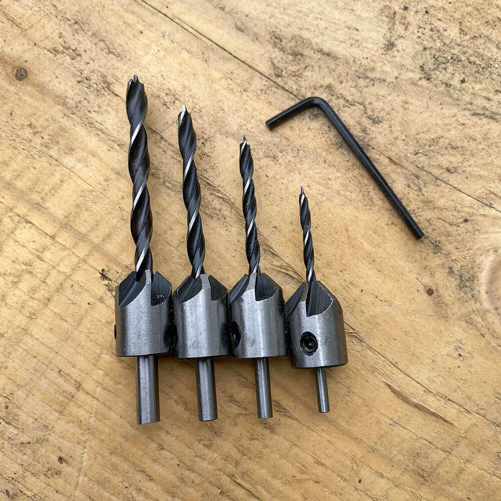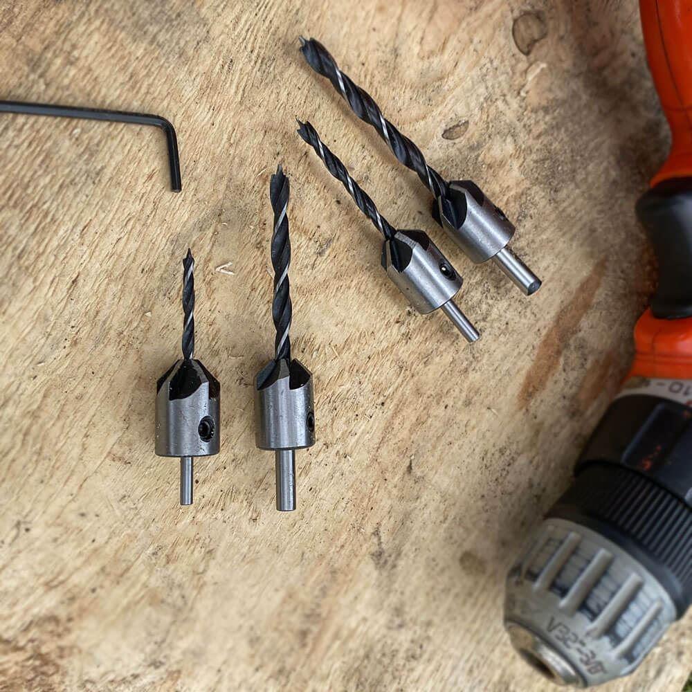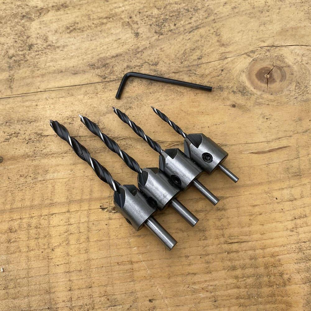 Hloubku vrtání lze nastavit pomocí inbusového klíče. Sada obsahuje 4 vrtáky se záhlubníkem o průměru 6, 5, 4 a 3 mm.