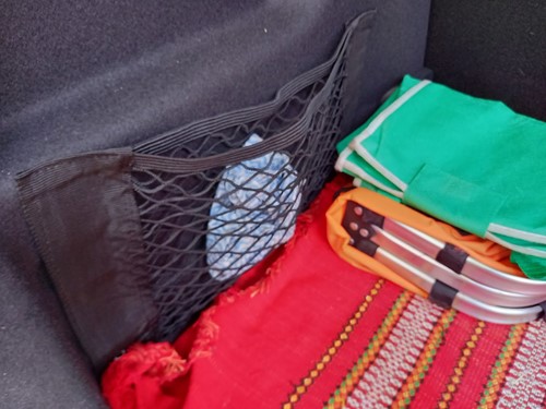 Jednoduchá a praktická pomůcka do kufru auta, suchý zip zatím drží i těžší předměty.