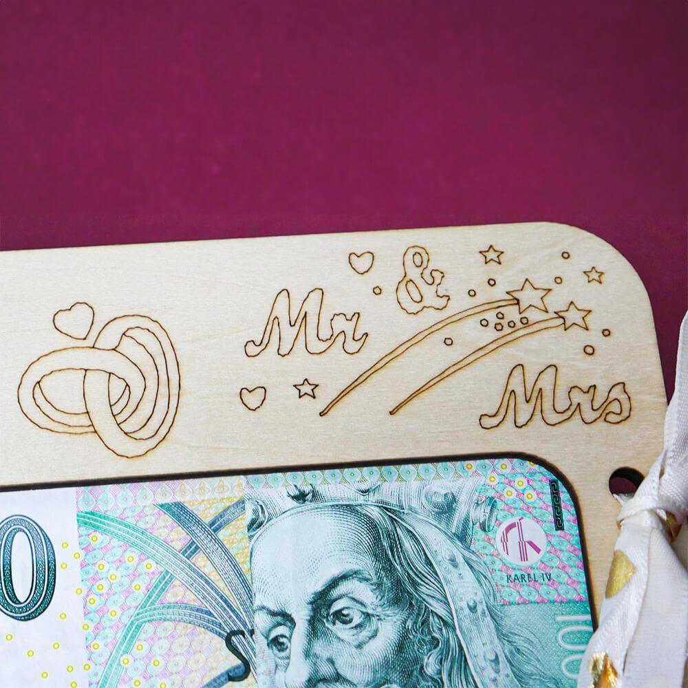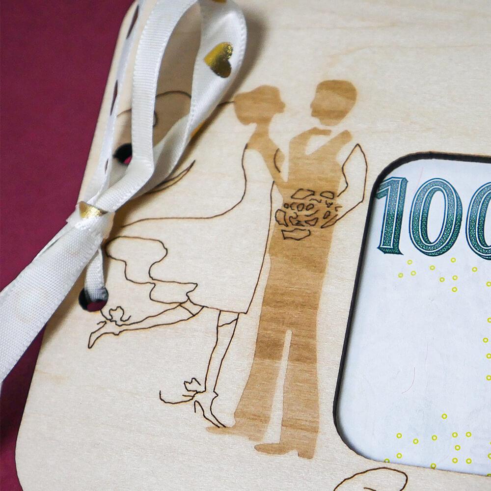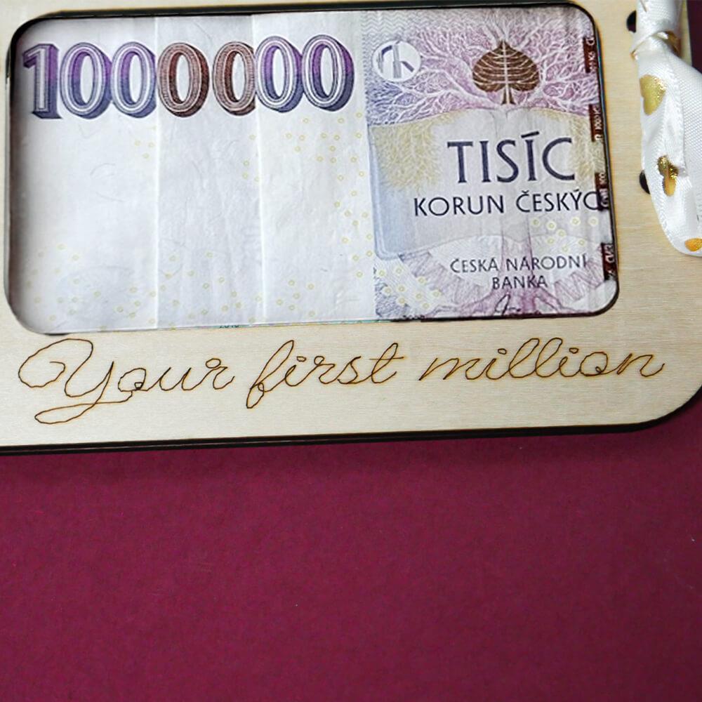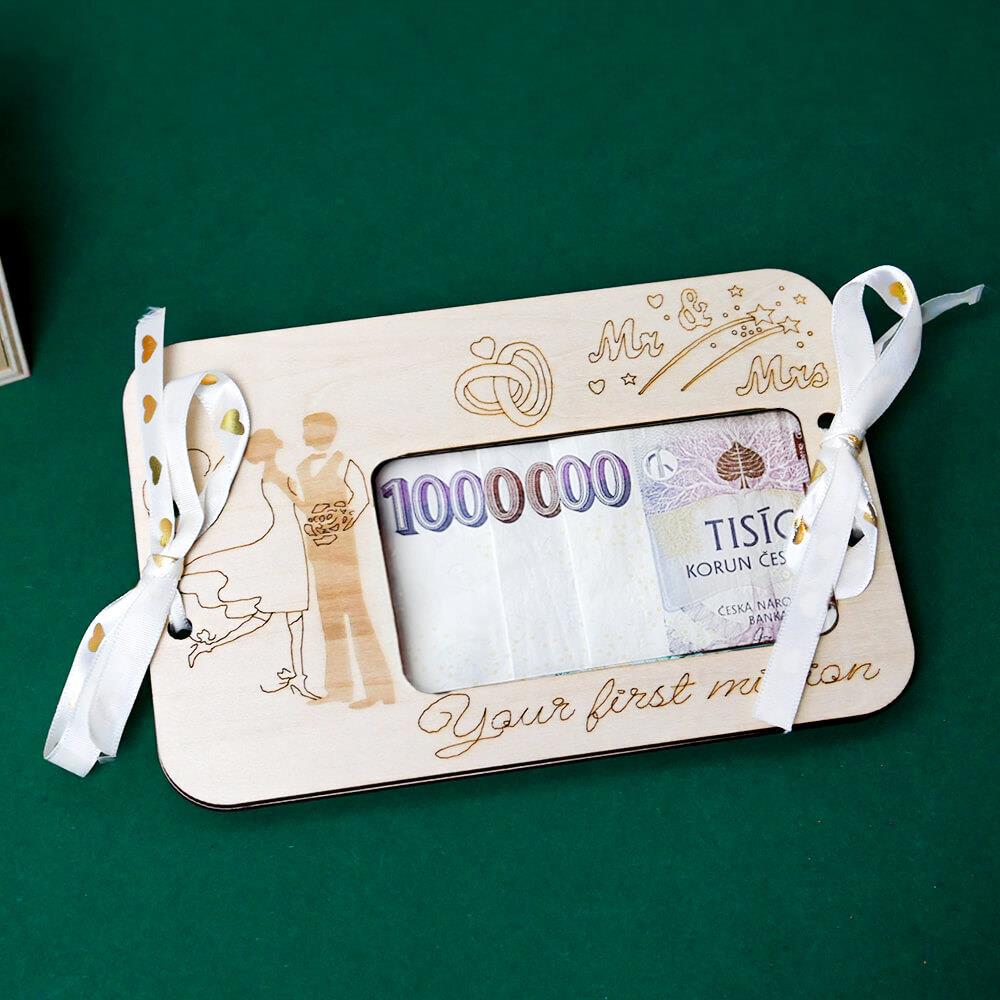 Přemýšlíte, jak originálně darovat peníze novomanželům? Dřevěné pouzdro s gravírovaným nápisem „Your first million“ je krásnou a vtipnou volbou, která zaujme na první pohled. Krásný dřevěný design, vygravírovaný pár a ozdobné mašličky dodávají celému dárku romantický nádech. Stačí vložit několik bankovek tak, aby vytvořily „milionový efekt“, a máte hotovo! Místo klasické obálky darujte něco, co má duši a příběh. Tento originální dárek ukazuje, že vám na novomanželích skutečně záleží. Udělejte jim radost způsobem, na který jen tak nezapomenou.