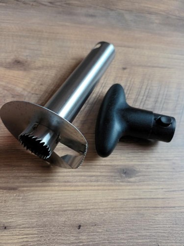 S tímto pomocníkem vydloubnete ananas, meloun či jablka bez problémů a bez zašpinění! Stačí jen spojit nerezovou část s plastovou a odříznout vršek ananasu. Pak už jen šroubujete jako s klasickou vývrtkou doprostřed ananasu až na dno. Následně vytáhnete „vývrtku“ a vytáhnete dužinu ananasu.