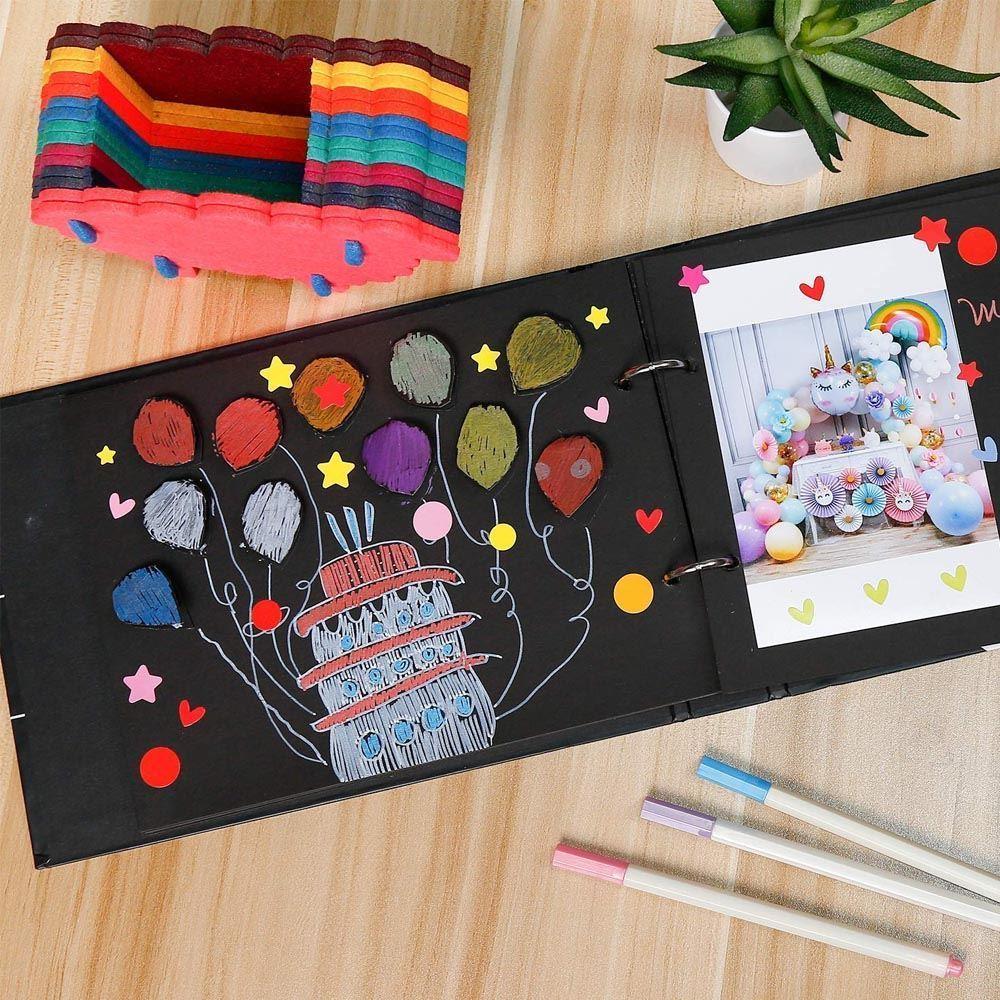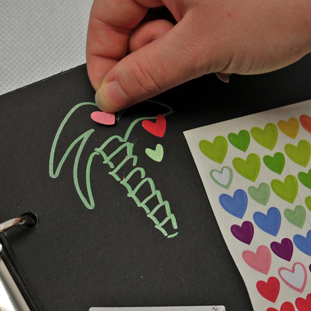 Pěkná ,pevná vazba.gelove tužka pěkně píší a fixy také. Nálepky jsou parádní a tužky na uchycení fotografií dobře drží. Už jen dodat fotky a mám super dárek.